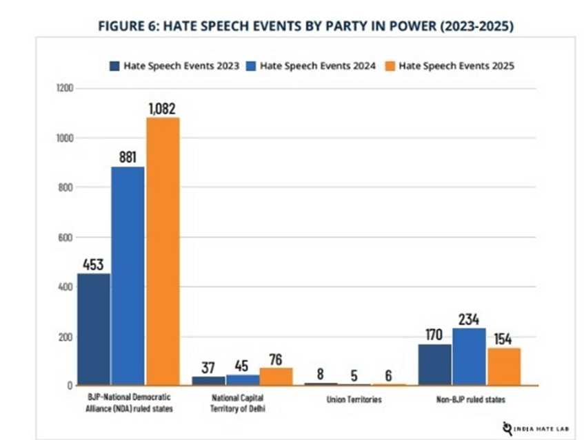 1164 வெறுப்புப் பேச்சு சம்பவங்கள் (88%) பா.ஜ.க நேரடியாக அல்லது கூட்டணிக் கட்சிகளுடன் ஆட்சி செய்யும் மாநிலங்கள் மற்றும் பா.ஜ.க நிர்வாகத்தின் கீழ் உள்ள டெல்லி உள்ளிட்ட யூனியன் பிரதேசங்களிலும் நிகழ்ந்துள்ளன. இது 2024-ஆம் ஆண்டில் பதிவு செய்யப்பட்ட 931 சம்பவங்களிலிருந்து 25% அதிகமாகும். அதேபோல் பா.ஜ.க ஆட்சித் தொடர்பில் இல்லாத மாநிலங்களில் வெறுப்புப் பேச்சுக்கள் மற்றும் பிரச்சாரங்கள் குறைந்துள்ளது என்பதும் இங்கே குறிப்பிடத்தக்கது.